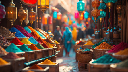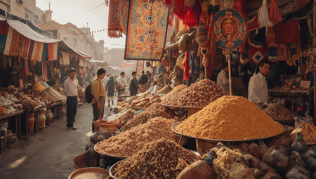Experience the vibrant atmosphere of a traditional spice market filled with colorful spices and herbs, showcasing rich cultural diversity under the warm sunlight.