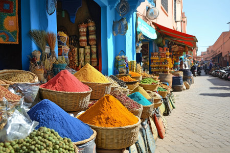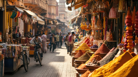 A bustling marketplace filled with colorful spices and local goods. This vibrant scene captures the essence of cultural shopping in an urban setting, showcasing tradition and everyday life.