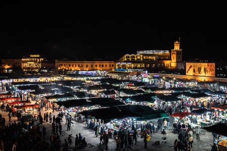 MARRAKECH, MOROCCO, JAN 15, 2019: Djemaa El Fna square by night, Marrakech, Morocco