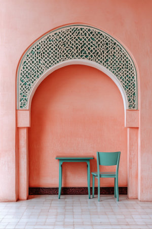 A photograph depicting an arch with Arabic geometric patterns carved into the wall. Behind the arch, there is an empty table and chair in a turquoise color, with white tiles on the floor. In front of the scene, there is a light pink background, showcasing a modern interior design style, captured from an eye-level angle. --ar 2:3 --v 6.1 Job ID: 899bfd61-dccd-442c-adb4-24de97a61073