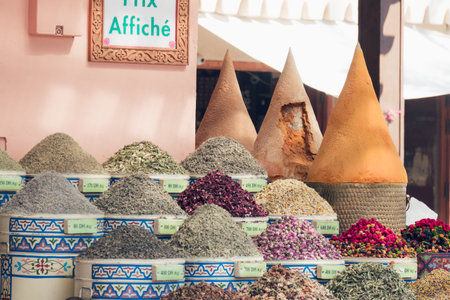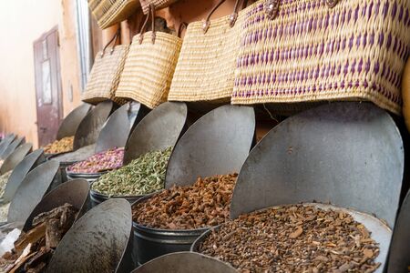Selection of spices on a traditional Moroccan market (souk) in Marrakech, Morocco
