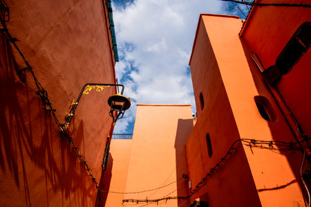 Bold orange walls and a decorative street lamp in a narrow alleyway of Marrakech, Morocco. Bright sunlight and shadows create a striking play of color and geometry under a vivid sky.