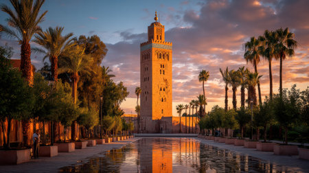 At sunset, Koutoubia Mosque stands tall in Marrakech, surrounded by palm trees and reflecting in the tranquil waters of the gardens. The sky glows with vibrant colors
