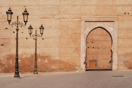 Classic architecture in medina, Marrakesh city, Morocco; streetlight and arabic arch gate