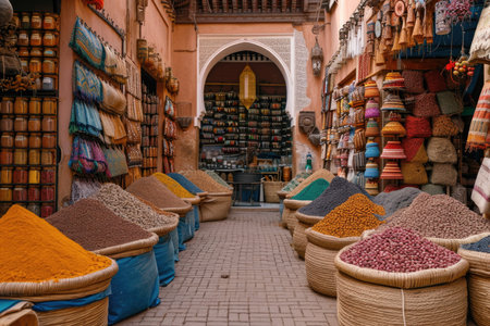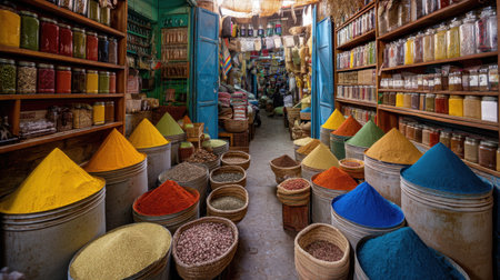 Explore a colorful marketplace filled with vibrant spices and traditional jars, showcasing the rich culture and lively atmosphere of Moroccan trade.
