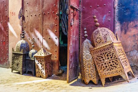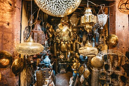 Moroccan metal lamps and ceramic in medina of Marrakesh