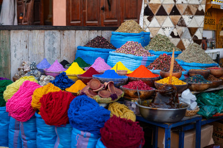 Display of spices and colorful products in the Jewish quarter of Marrakech in Maorc