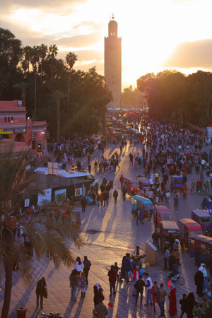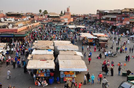 MARRAKESH, MOROCCO - MAY 25, 2014: Sunset over Jamaa el Fna (also Jemaa el-Fnaa, Djema el-Fna or Djemaa el-Fnaa) square and market place in medina quarter. During the night it´s full of food-stalls