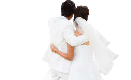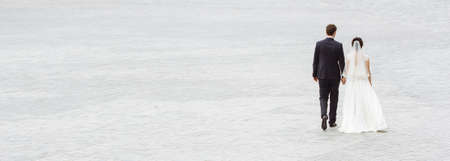 Wedding couple walking away. Empty with space for text