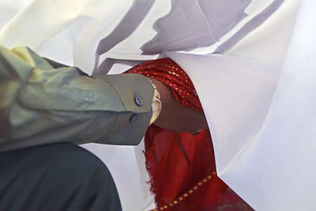 Horizontal color capture taken at a hindu wedding in Surat India Part of the ceremony is that the couple hold hands covered by a silk sheet whilst the rituals are being performed by clergy