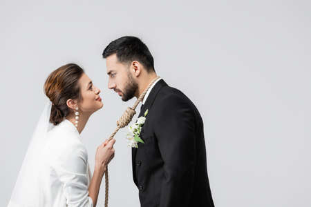 Side view of smiling bride holding slip knot on neck of muslim groom isolated on gray