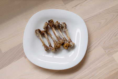 Multiple chicken bones on a white plate.
