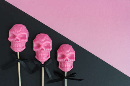 three pink lollipops in the shape of a skull on a stick on a pink and black background. the concept of Halloween.