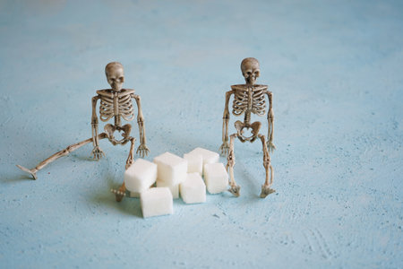 Refined sugar chunks are lying on a blue table, next to two skeletons, the concept of unhealthy food. Sugar kills.