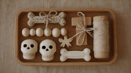 A captivating arrangement of natural wooden elements including skull and bone shapes, perfect for crafting projects and minimalistic home decor inspiration.