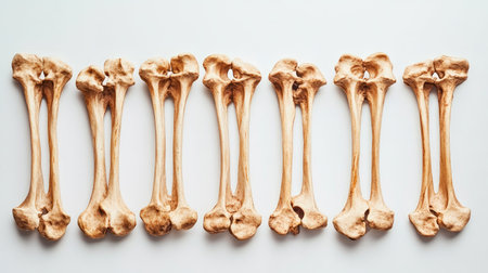 A detailed arrangement of crossed femur bones displayed on a smooth white background, offering a clear view for educational and anatomical purposes.
