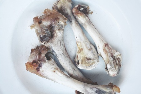 Chicken bones with meat scraps on a white background