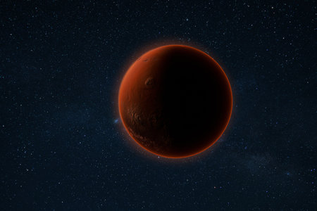 Abstract glowing hot isolated mars planet and starry sky on black background.