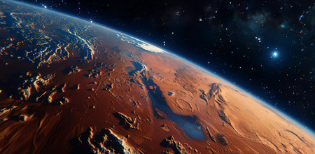 A stunning depiction of Mars showcasing its striking reddish surface under a cosmic backdrop. The planets craters and valleys create a mesmerizing sight, inviting exploration and curiosity.