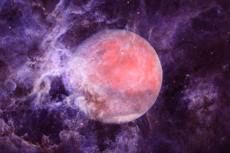 Close up shot of red solar system planet isolated on dark sky background, beautiful dramatic scene template, abstract artistic concept.