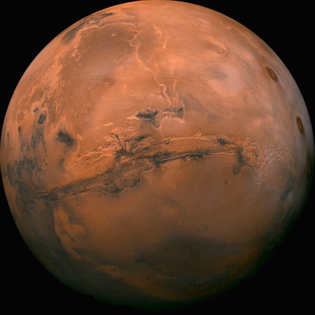 Red planet Mars in outer space, showing a detailed surface under a starry sky, symbolizing astronomy, exploration, and the solar system.