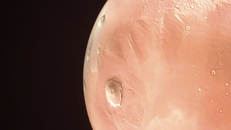 The breathtaking view captures the distinct reddish surface of Mars, showcasing its craters and rugged terrain under the vast backdrop of space. A glimpse into our neighboring planets mysteries.
