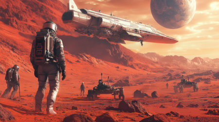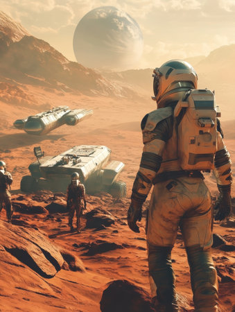 A group of astronauts traverses the rocky landscape of Mars, with their spacecraft parked in the background amidst a colorful sky.