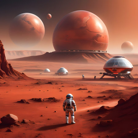 Mars Colonization and Space Cities A high-tech colony on Mars with astronauts and scientists walking among futuristic dome structures, with Earth visible