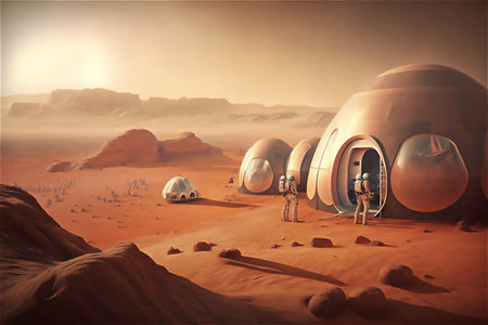 Martian colony with biodomes A sprawling Martian colony set against a red, rocky landscape under a dusty, orange sky. The colony is composed