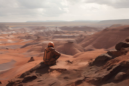 person, sitting on a cliff, overlooking the red and dusty landscape of colonizing mars, created with generative ai
