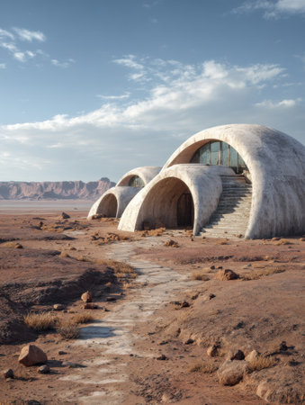 Futuristic buildings stand out in a barren desert, showcasing smooth curves and large glass windows against a vast blue sky.