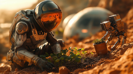 Astronaut and robot collaborating to grow plants on Mars, with futuristic habitat visible in the background. Concept of space sustainability and innovation.