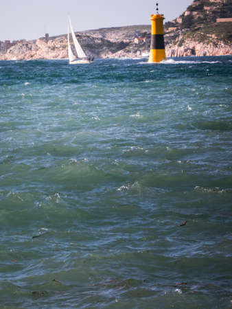 Seascape view at coast side of Mediterranean sea near port in Marseille, France, under clear blue sky