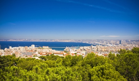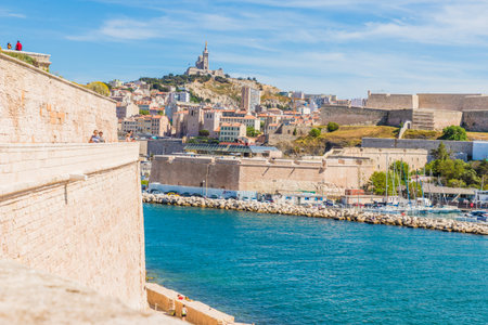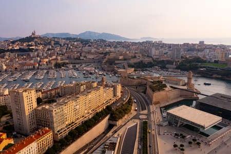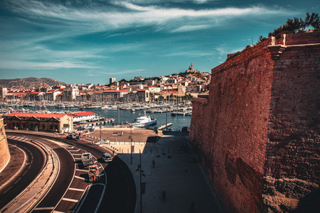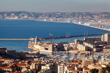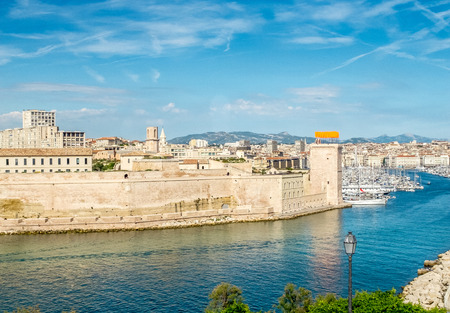 Marseille cityscape on Mediterranean coast overlooking Old Port and Fort Saint-Jean