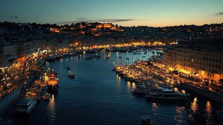 Marseille Old Port and Fort Saint-Jean in night. Marseille, France