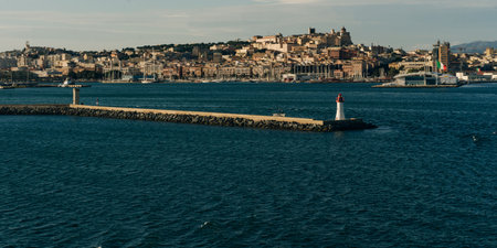 Seascape view at coast side of Mediterranean sea near port in Marseille, France, under clear blue sky