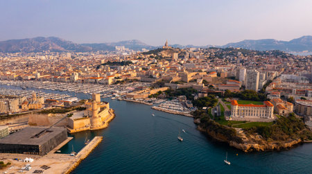 Aerial view of coastal area of Marseille with Fort Saint-Jean and Old Port