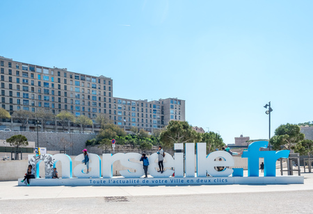 MARSEILLE - APRIL 11 : Marseille.fr logo at front of Museum of European and Civilization near old port of Marseille, France, on April 11, 2017.