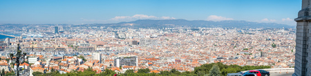 Panorama view of cityscape landmark viewpoint of Marseille, from Notre-Dame de la Guard catholic church, under clear blue sky in France