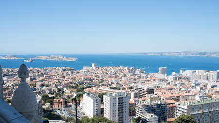 aerial view of Marseille, France, from Notre-Dame de la Garde, with the Mediterranean sea and Les Isles islands in the background