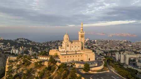 MARSEILLE, FRANCE - OCTOBER 02, 2017: Aerial view of Notre-Dame de la Garde, symbol of Marseille