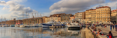 Marseille, France - October 19, 2013: Panoramic view of the old port harbor with docked yachts and colorful building in the background with people enjoying a beautiful day