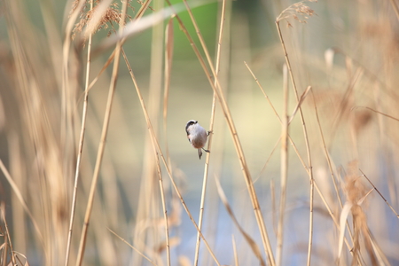 Common reed bunting, male. The bird plucks out the reed mace seeds.