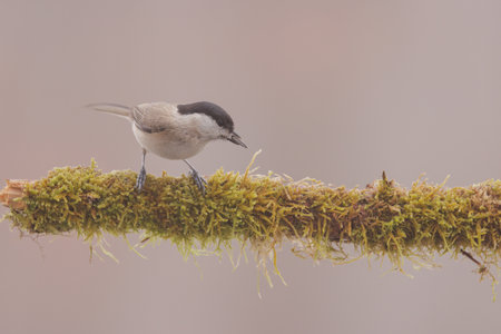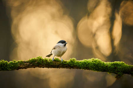 Marsh Tit (Poecile palustris), black and white songbird sitting on the nice lichen tree branch, Czech. Bird in nature. Songbird in the nature habitat. Cute songbird in winter scene