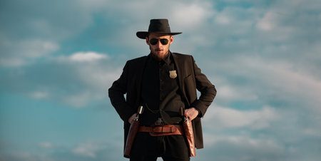 Sheriff in black suit and cowboy hat, banner. Wild west, western, man with vintage pistol revolver and marshal ammunition.