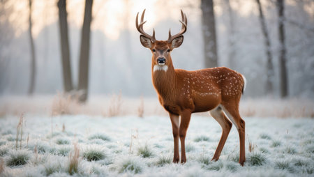 A solitary deer stands in a serene winter landscape, surrounded by snow-covered trees and a tranquil atmosphere of soft light and frost.