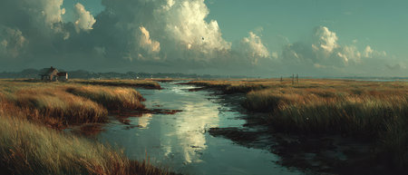 A tranquil marsh features tall grasses and a winding stream under a dramatic sky with fluffy clouds. A solitary structure stands in the distance.
