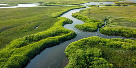 Captivating aerial perspective showcases a winding river flowing through vibrant marshland, featuring diverse greenery and rich habitat.