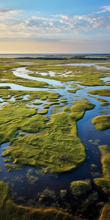 Serene salt marsh landscape in Pleasant Bay, Cape Cod, Massachusetts, featuring meandering channels, lush vegetation, and tranquil atmosphere, perfect for wildlife habitation.