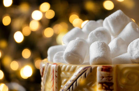 Cup of marshmallows with bokeh lights, cozy and sweet atmosphere concept